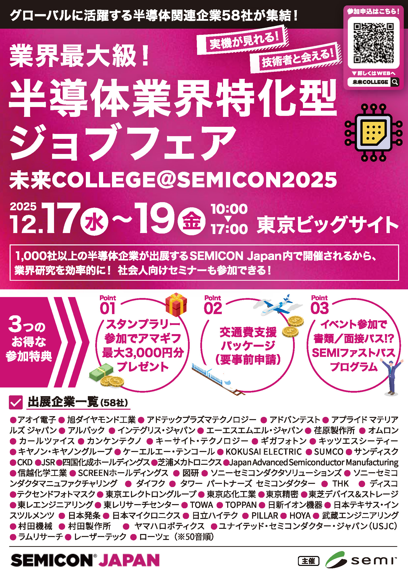 今年も「SEMICON Japan 2025」の出展と併せて、当社は学生向けの業界研究イベント「未来COLLEGE@SEMICON2025」に参加いたします。半導体業界に関心をもつ学生の方々へ、半導体製造への理解をより深めてもらうために、事業内容から仕事のやりがいまで、ロボットの展示やエンジニアによる解説も含めて詳しくおこないます。